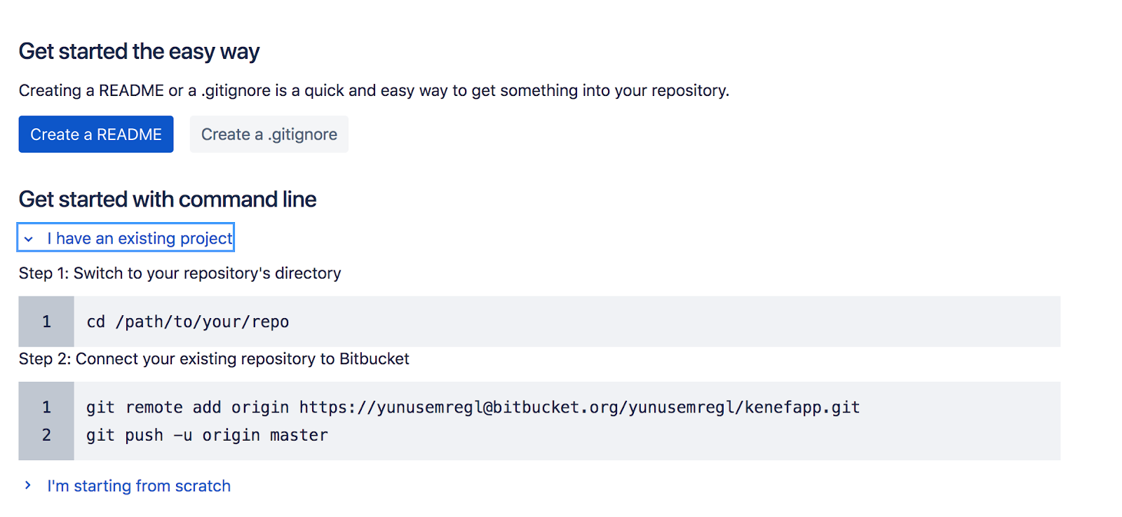 4. Bu ekranda "Get Started with command line" kısmının altndaki ilk seçenek olan "I have an exist project" seçeneğini seçiyoruz ve karşımıza aşağıdaki ekran geliyor.